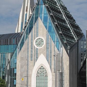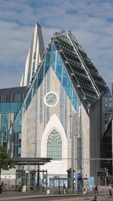 Die asymmetrische Giebelfassade enthält eine beabsichtigte Linie im Stein über dem Maßwerkfenster, die den Moment der Zerstörung der historischen Kirche markiert.