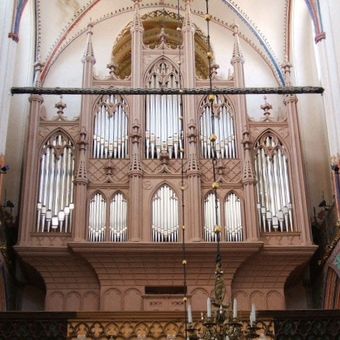 Orgel der St.-Nikolai-Kirche, Pfeifenorgel in der Nikolaikirche, Stralsund, Deutschland.