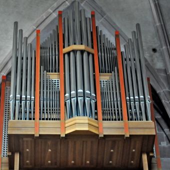 Die Pfeifenorgel nimmt eine zentrale Position in der St. Lorenzkirche ein, mit mehreren Pfeifenreihen an den Innenwänden.