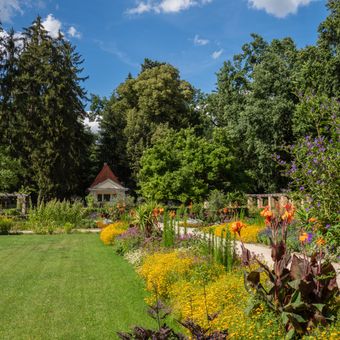 Die Volksgartenanlage erstreckt sich über Grünflächen mit Wegen, Gärten und architektonischen Elementen einschließlich eines Musikpavillons und der Sankt-Nepomuk-Statue.