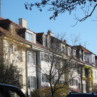 Die Villenkolonie Gern zeigt Reihenhäuser mit Vorgärten nördlich des Nymphenburger Kanals zwischen Klug-, Waisenhaus- und Gernerstraße.