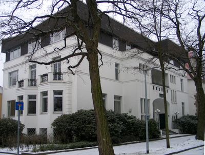 Die Hindenburg-Villa zeigt Prinzipien der Reformarchitektur mit zwei Vollgeschossen unter einem großen Walmdach in der Bristoler Straße 6.