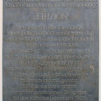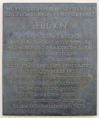 Die Beth Zion Synagoge steht in der Brunnenstraße 33, mit traditionellen religiösen Architekturelementen und einer hebräischen Inschrift über dem Eingang.