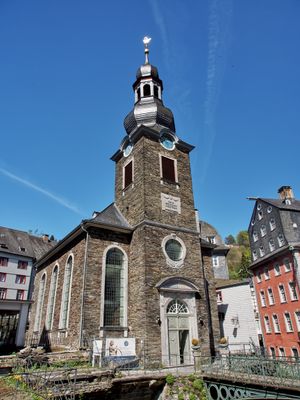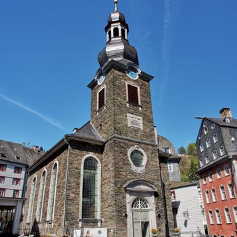 Die Evangelische Kirche steht im Zentrum von Monschau an der Rur, mit einer schlichten Außengestaltung im Kontrast zur kunstvollen Innenausstattung.