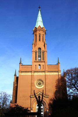 Die Friedenskirche zeigt eine Konstruktion aus roten Ziegeln mit mehreren architektonischen Elementen einschließlich romanischer, gotischer, Renaissance und klassischer Merkmale.