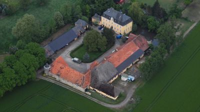 Das ehemalige Ritterschloss zeigt ein siebenachsiges barockes Hauptgebäude mit Mansardendach und Fachwerk-Wirtschaftsgebäuden im Außenbereich.