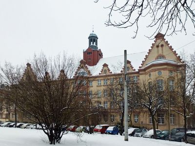 Die Leibnizschule ist ein Schulgebäude mit Denkmalsschutz in Leipzig-Zentrum mit drei Flügeln, die einen zentralen Innenhof umgeben. Die klassische deutsche Architektur zeigt sich in den Fassadenelementen und der großzügigen Anordnung des Komplexes mit Unterrichtsräumen auf mehreren Ebenen.