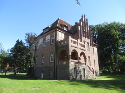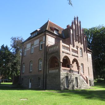Die Kommandeurvilla zeigt architektonische Elemente, die für norddeutsche Wohnhäuser des frühen zwanzigsten Jahrhunderts typisch sind, mit strukturierter Fassade.