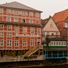 Das Lösecke-Haus steht am Stintmarkt mit einer Fachwerkfassade zur Wasserseite und einer Backsteinfassade zur Straßenseite.