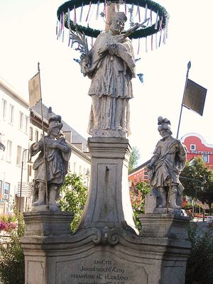 Skulpturengruppe mit Steinfiguren der hl. Johannes von Nepomuk, Sebastian und Florian