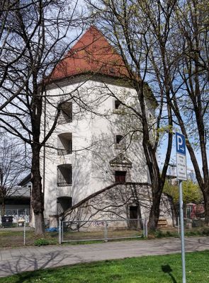 Hochbunker, freistehender, viergeschossiger Turm über achteckigem Grundriss mit Zeltdach, zweiläufige Freitreppe an der Westseite, nach Plänen von Karl Meitinger, 1941, 1948 durch Sprengung der südöstlichen Fensterreihe zur Herberge für obdachlose Frauen u