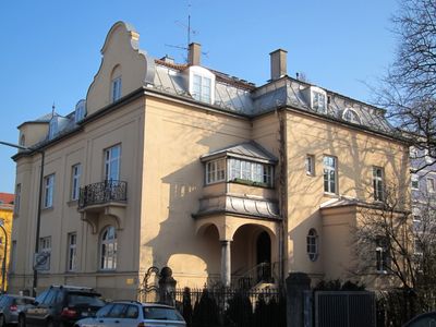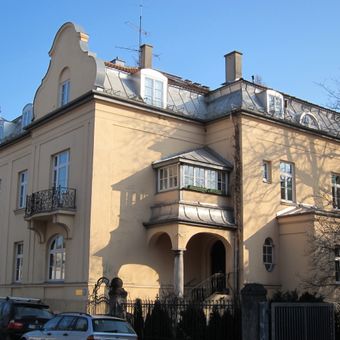 Zweigeschossige Villa, reduziert barockisierende Formen, 1898 von Ludwig C. Lutz, in Ecklage mit Mansarddach.