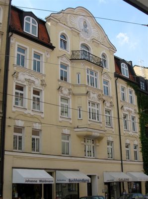 Mietshaus, Neubarock, reich gegliedert, mit Erker und reichem Stuckrelief im Schweifgiebel, um 1895 von Korbinian Schmid nach Entwurf von Carl Hocheder d. Ä.