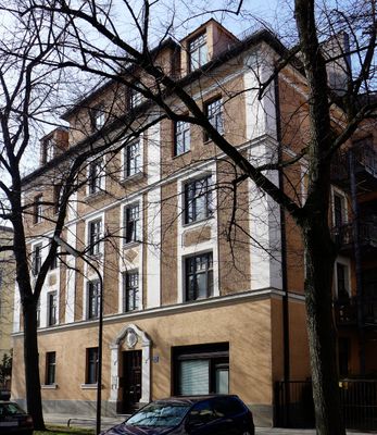 Mietshaus, viergeschossiger später Jugendstil-Eckbau mit Erker, Balkons und Putz- bzw. Stuckgliederung, Anfang 20. Jahrhundert