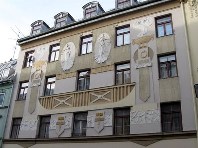 Mietshaus, Jugendstil, mit sehr reichem, phantasievollem Stuckdekor (z. T. figürliche Reliefs), 1903–04 von Hans Thaler (Architekt), Fassadengestaltung von Max Scheidl.
