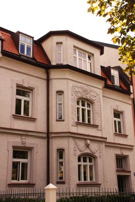 Mietshaus, zweigeschossiger Mansarddachbau mit erhöhtem Bodenerker und jugendstiligem Stuckdekor, um 1900