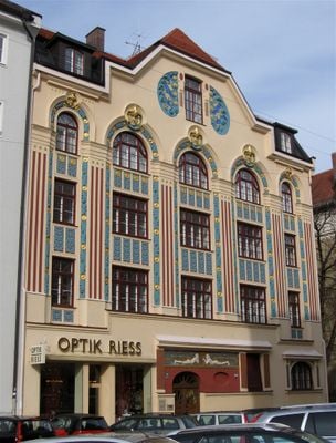 Das vierstöckige Gebäude in der Ainmillerstraße 22 weist eine polychrome Fassade mit figurativen Verzierungen und halbrunden Fenstern auf, entworfen von Felix Schmidt und Ernst Haiger.