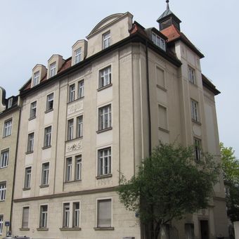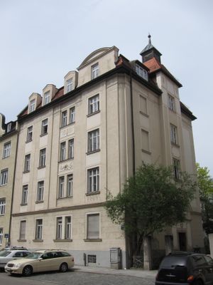 Mietshaus, Jugendstil, mit zartem Stuckdekor (u. a. Fledermausrelief), 1903 von R. Böhm.