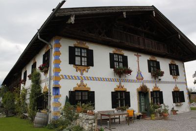 Bauernhaus, zweigeschossiger stattlicher Flachsatteldachbau mit Hochlaube, Zier-, Vorbund, Traufbundwerk und Fassadenmalerei, bezeichnet 1779.