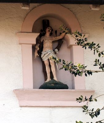 Hausfigur Hl. Sebastian, Farbig gefasste Holzskulptur, spätes 18./frühes 19. Jahrhundert