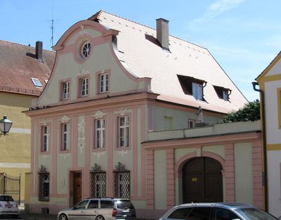 Ehemaliges Adelspalais, zweigeschossiger Bau mit Schweifgiebel, Lisenengliederung und Fassadenstuck, wohl von Giovanni Domenico Barbieri, um 1730;