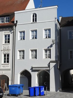Wohn- und Geschäftshaus, dreigeschossig, mit Satteldach und Vorschussmauer, angesetzter Stützpfeiler, zurückgesetzt zweigeschossige Überbauung der Mautgasse, mit rundbogiger Durchfahrt, im Kern 16. Jahrhundert