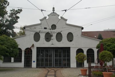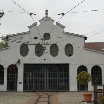 Straßenbahn-Depot, vierschiffige Halle mit Holzstützen, offenem Dachstuhl und breitgezogener, in barocken Formen mit ovalen Fenstern gestalteter Frontseite, um 1900
