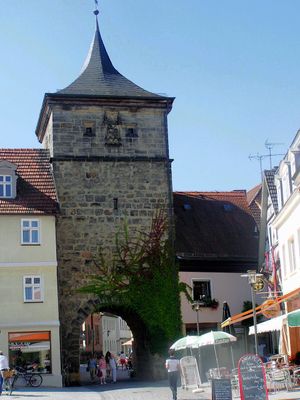 Bamberger Tor, viergeschossiger Torturm aus unverputzten Sandsteinquadern, geschweifte Haube, 14./16. Jahrhundert