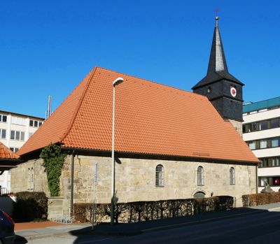 Katholische Spitalkirche zur Schmerzhaften Muttergottes, 14./18. Jahrhundert, ehemalige Chorturmkirche, heute flachgedeckter Saal zu drei Achsen, Sandsteinquaderbau, teilweise Brockenmauerwerk, Turm mit verschiefertem Oberbau; mit Ausstattung