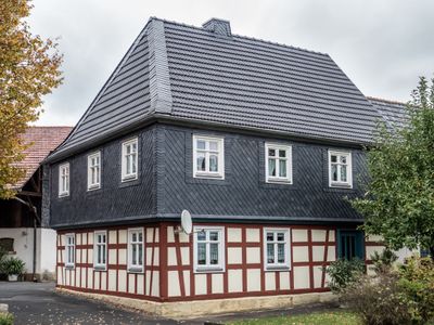 Fachwerkbau, zweigeschossig mit abgewalmtem Satteldach, Obergeschoss verschiefert, frühes 19. Jahrhundert