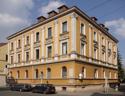 Mietshaus, Doppelhaus, dreigeschossiger, U-förmiger Walm- bzw. Satteldachbau, verputzt, mit Neorenaissancegliederung, um 1895