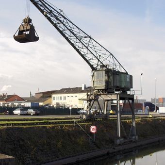 Drehkran, mit einhüftigem Fahrgestell auf Schienen am geböschten Kai, mit festem Ausleger über dem Führerhaus, 1921 von der Fa. M.A.N.; mit technischer Ausstattung
