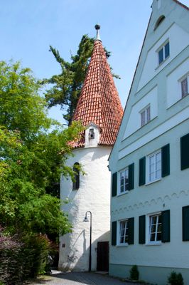 Sog. Prügelturm, Rundturm mit hohem Kegeldach und kleinen Giebeln über drei Scharten, ehem. an der Nordwestecke der Stadtmauer, 15. Jahrhundert