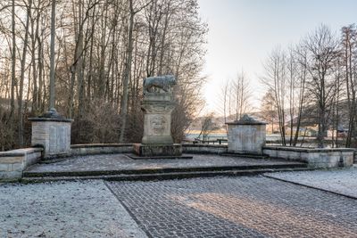 Kriegerdenkmal für 1870/71, exedraförmige Anlage mit Inschriftstelen und reißendem Löwen, Sandstein, um 1910