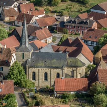 Katholische Pfarrkirche St. Antonius, Saalkirche mit eingezogenem Chor und mittlerem Fassadenturm, Sandsteinquaderbau mit neuromanischer Gliederungen und Satteldach, 1886/87, Turm mit Pyramidendach, 15. Jahrhundert; mit Kirchenausstattung