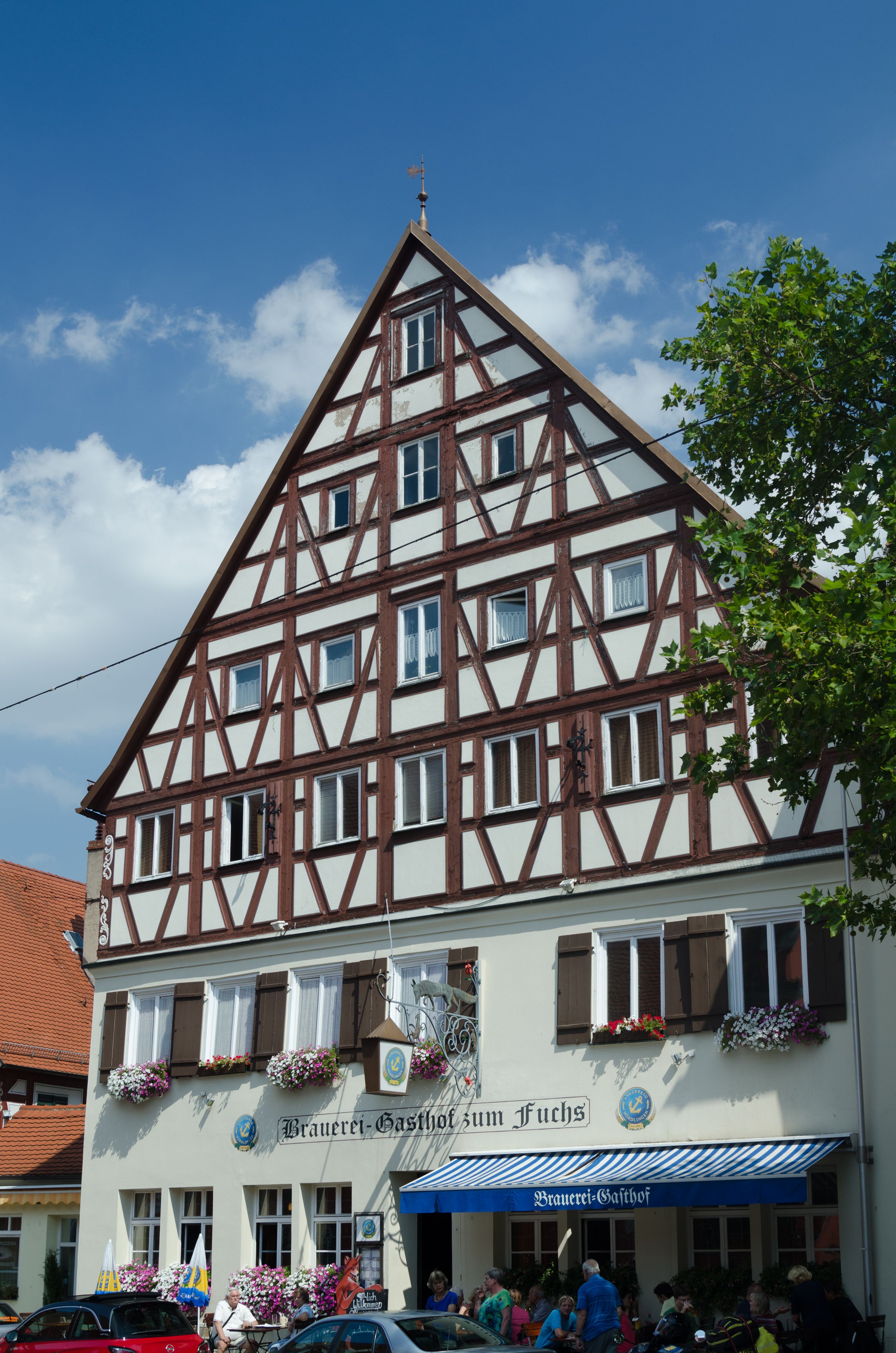 Gasthaus zum Fuchs, stattlicher dreigeschossiger Fachwerkbau, mit giebelständigem Satteldach und aufgebrettertem Fachwerkgiebel, zum Teil verputzt, Eckständer mit Schnitzdekor, bezeichnet „1700“, im Kern spätmittelalterlich
