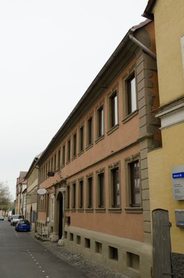 Traufseithof, zweigeschossiger Massivbau mit geohrten Fensterrahmen und Pilasterportal, erste Hälfte 18. Jahrhundert
