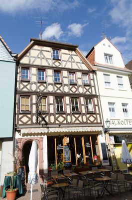Halbwalmdachhaus mit überbrettertem Fachwerk, Renaissance-Portal, im Kern um 1600
