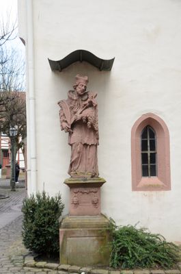 Sankt-Nepomuk-Statue, inschriftsockel mit Figur des heiligen Johann Nepomuk, Sandstein, bezeichnet „1713“
