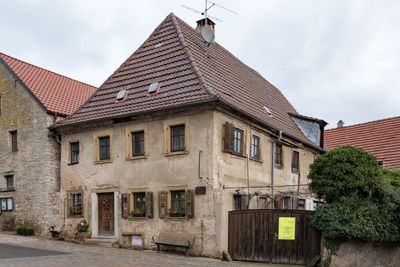 Wohngebäude, zweigeschossiger, verputzter Walmdachbau, wohl mit Fachwerkobergeschoss und geohrten Rahmungen, 18. Jahrhundert