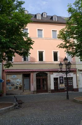 Wohnhaus, dreigeschossiger Traufseitbau, um 1835/40, Erdgeschoss durch Ladeneinbau verändert