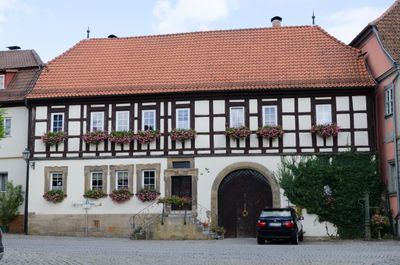 Halbwalmdachhaus, zweigeschossig, traufseitig, mit Hofdurchfahrt (bezeichnet 1558/1604), Fachwerkobergeschoss, Freitreppe mit Schmiedeeisengeländer, 16. bis 18. Jahrhundert