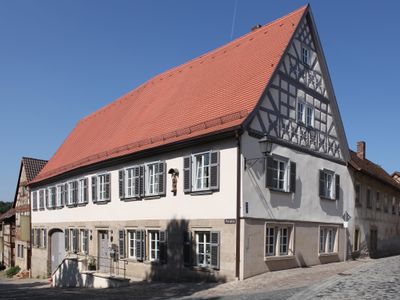 Pfarrhof, vierseithofanlage mit stattlichem zweigeschossigem Satteldach-Wohnhaus mit Hofeinfahrt, Fachwerkobergeschoss, Freitreppe, 16. Jahrhundert Mitte 19. Jahrhundert; mit Ausstattung