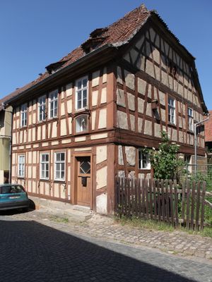 Halbwalmdachhaus, zweigeschossig, in Traufstellung, Fachwerk, spätes 18. frühes 19. Jahrhundert