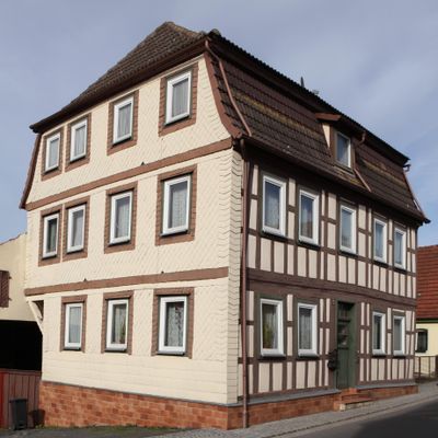 Zweigeschossiges Mansard-Halbwalmdachhaus, Fachwerk, westliche Giebelseite verschiefert, Anfang 19. Jahrhundert