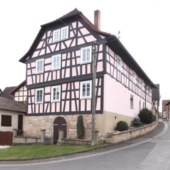 Zweigeschossiges Halbwalmdachhaus, Fachwerk über hohem gemauerten Sockel, Laube, 18./19. Jahrhundert