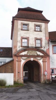 Torhaus, sogenannter äußerer Torturm, dreigeschossiger, verputzter Massivbau mit Mansarddach, rundbogiger Tordurchfahrt, Putzgliederung und Wappenschild aus Sandstein, zwischen 1783 und 1799 erbaut