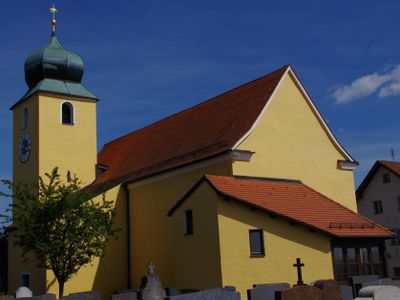 Katholische Pfarrkirche St. Lambert, saalbau mit eingezogenem Chor und verschindeltem Dachreiter mit Zwiebelhaube, gotisch, 14./15. Jahrhundert, 1732 umgebaut; mit Ausstattung