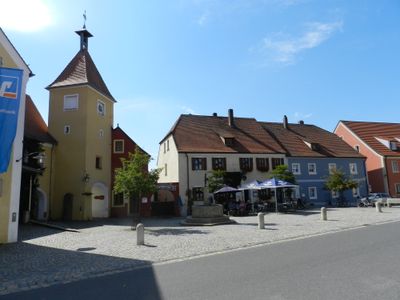 Torturm, sogenannter Hußturm, Spätmittelalterlich, im oberen Teil erneuert; Granitstein mit ausgehauenem Schwert, nachmittelalterlich, in die Ostwand des Turmes eingemauert; siehe Marktplatz 1, Kirchhofbefestigung