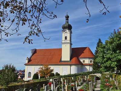Die St. Nikolaus Kirche steht am Kirchplatz 6 und zeigt traditionelle bayerische Architekturelemente im Zentrum der Stadt.